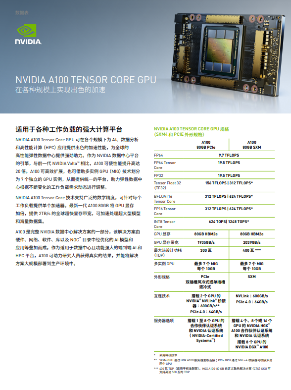 NVIDIA A100 Tensor Core GPU 可针对 AI、数据分析和 HPC 应用场景,在不同规模下实现出色的加速,有效助力更高性能的弹性数据中心。A100 采用 NVIDIA Ampere 架构,是 NVIDIA 数据中心平台的引擎。A100 的性能比上一代产品提升高达 20 倍,并可划分为七个 GPU 实例,以根据变化的需求进行动态调整。A100 提供 40GB 和 80GB 显存两种版本,A100 80GB 将 GPU 显存增加了一倍,并提供超快速的显存带宽(每秒超过 2 万亿字节 [TB/s]),可处理超大型模型和数据集。