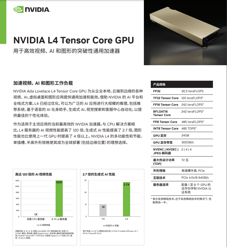 NVIDIA L4 Tensor Core GPU 基于 NVIDIA Ada Lovelace 架构构建,采用低外形尺寸封装的 L4 GPU 是一款经济高效的解决方案,可在从边缘、数据中心到云端的每台服务器中实现高吞吐量和低延迟。