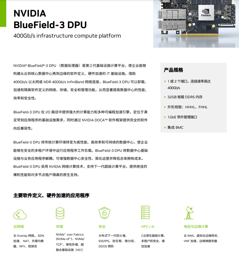 NVIDIA® BlueField® 网络平台为现代数据中心和超级计算集群带来了前所未有的创新。凭借强大的计算能力以及用于网络、存储和安全加速的内置软件定义硬件加速器,BlueField 可为各种环境中的多种工作负载提供安全的加速基础设施,助力企业步入加速计算和 AI 的新时代。