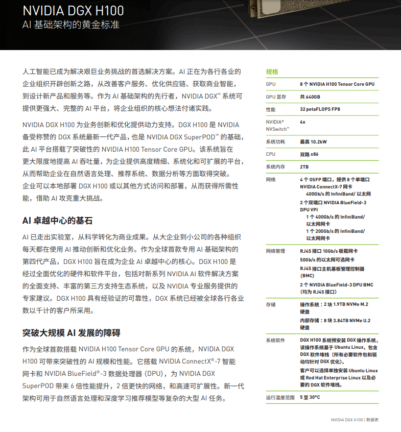 利用 NVIDIA DGX™ H100 拓展创新和优化的前沿领域。DGX H100 是 NVIDIA 传奇的 DGX 系统的最新迭代,也是 NVIDIA DGX SuperPOD™ 的基础,它是由 NVIDIA H100 Tensor Core GPU 的突破创新加速的 AI 动力之源。